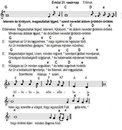 Előénekes: Magasztallak téged, Istenem, Királyom, * és áldom nevedet örökkön-örökké. Mindennap áldalak téged, * és dicsőítem nevedet örökkön-örökké.